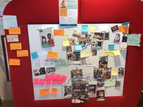 With the above methods, we gathered a lot of materials and data, and two personas was made for the target group and one that represents the stores we are designing for. This will guide us in a design process and provide us with understanding of their common traits. Since it was a massive amount of information and materials, we brought into a synthese wall to map out their relatedness, but also to generate insights that we might overlook.
